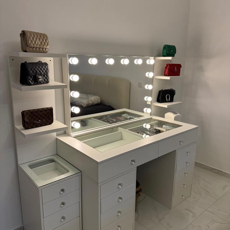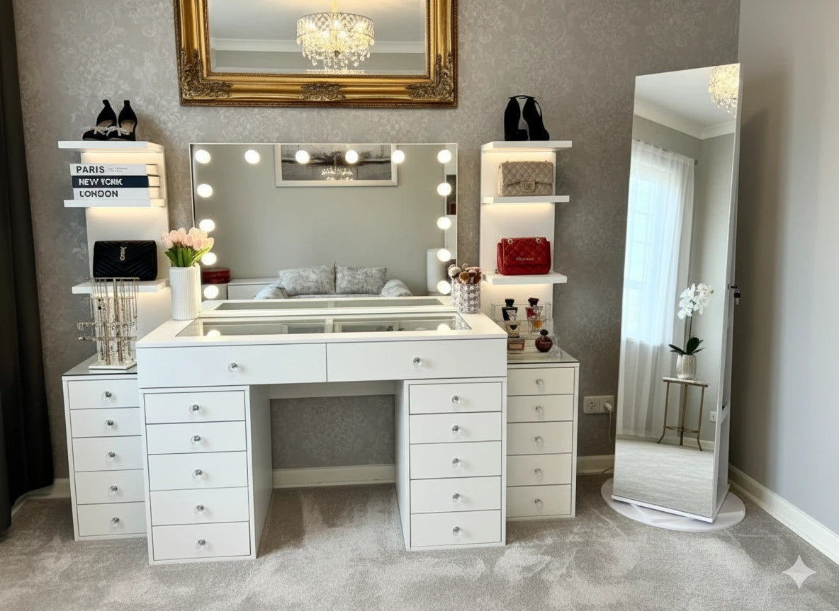 Entdecke exklusive Schminktische im Premium-Design – mit beleuchtetem Spiegel, großzügigem Stauraum und hochwertigen Details wie Glasplatten oder samtbezogenen Hockern. Unsere Modelle vereinen modernes Interior-Design mit funktionalen Highlights wie LED-Spiegeln, geräumigen Schubladen und Organizer-Systemen für deine tägliche Beauty-Routine.