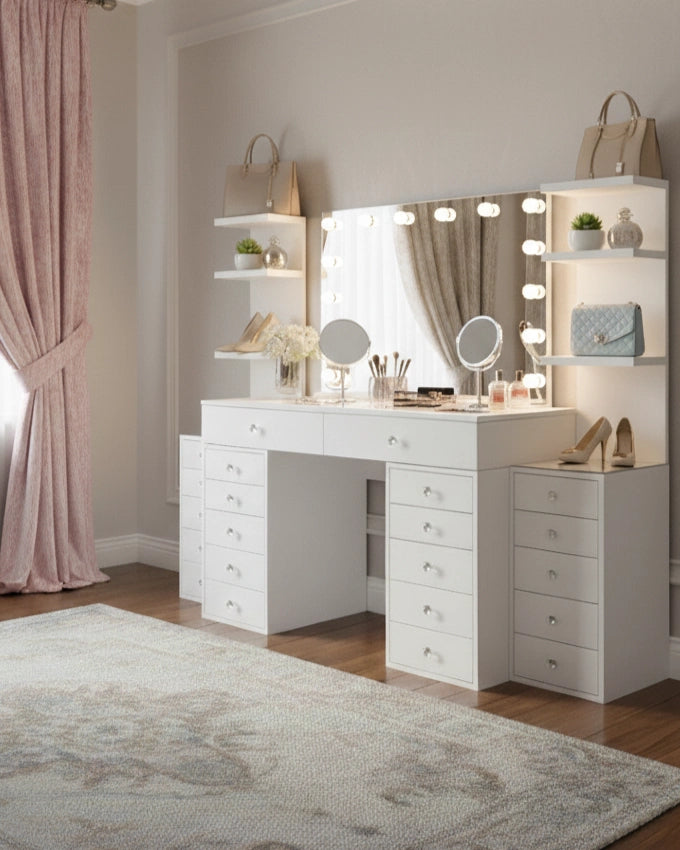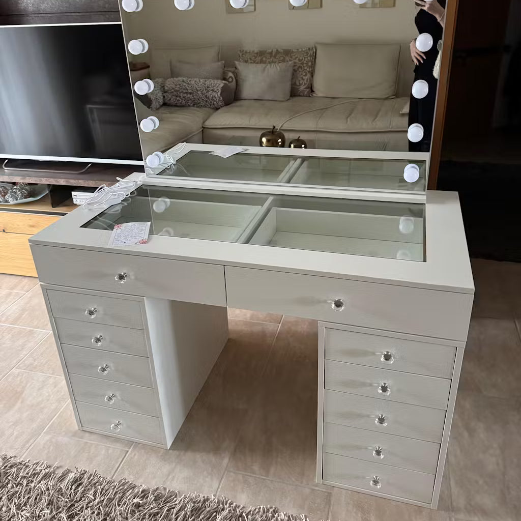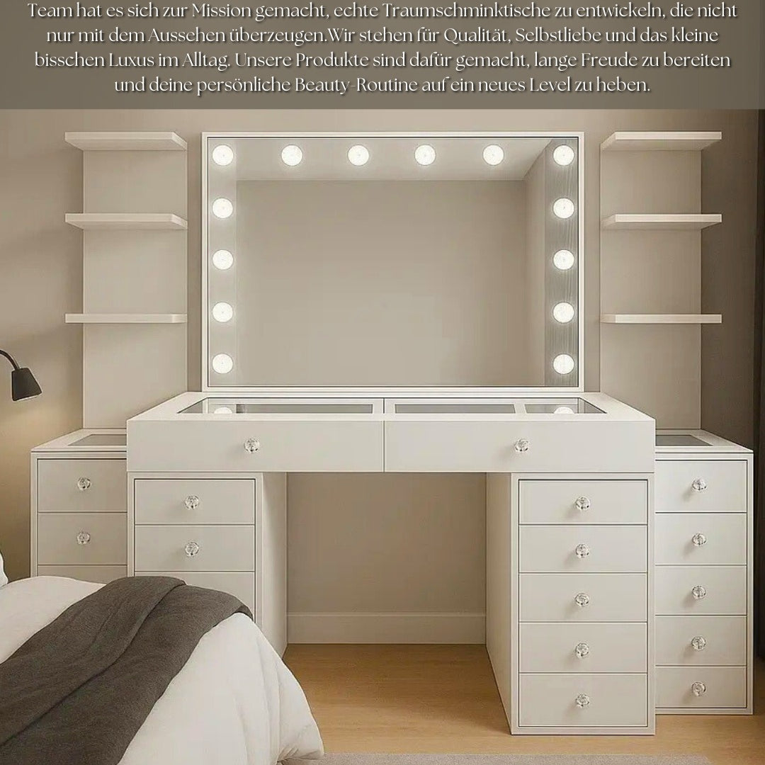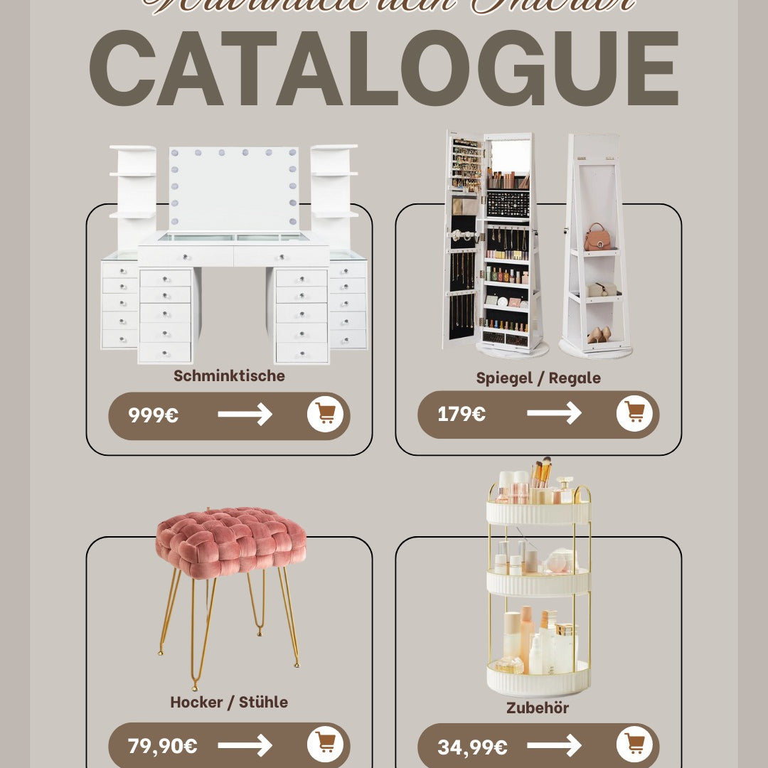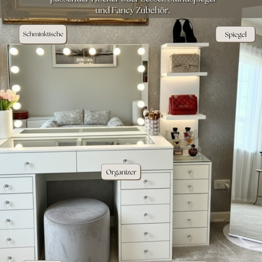 Entdecke exklusive Schminktische im Premium-Design – mit beleuchtetem Spiegel, großzügigem Stauraum und hochwertigen Details wie Glasplatten oder samtbezogenen Hockern. Unsere Modelle vereinen modernes Interior-Design mit funktionalen Highlights wie LED-Spiegeln, geräumigen Schubladen und Organizer-Systemen für deine tägliche Beauty-Routine.
