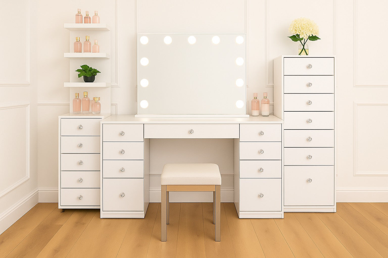 Die Diamond Hollywood Station strahlt vor Eleganz und Perfektion. Fühlst du es schon, wie deine Beauty Produkte clean abgelegt sind? Welche Taschen möchtest du auf den Regalen abstellen? Welcher Sitzhocker passt hier rein?