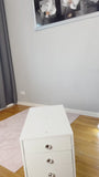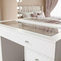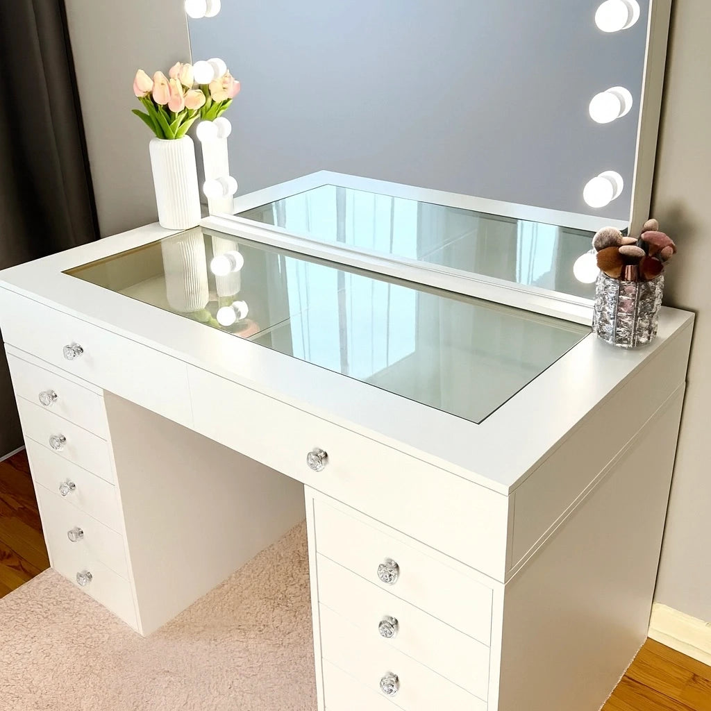 Die Kombination aus einer eleganten Glasplatte, hochwertigen Materialien und Kristalloptik-Schubladengriffen verleiht deinem Schminkplatz eine luxuriöse und moderne Note. Trotz des großzügigen Stauraums bleibt der Tisch kompakt und fügt sich perfekt in jedes Schlafzimmer oder Ankleidezimmer ein.