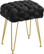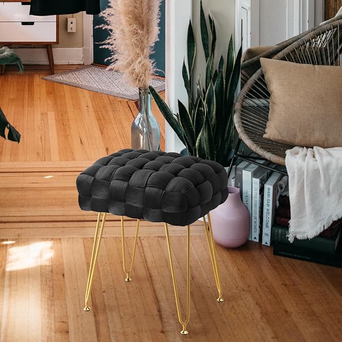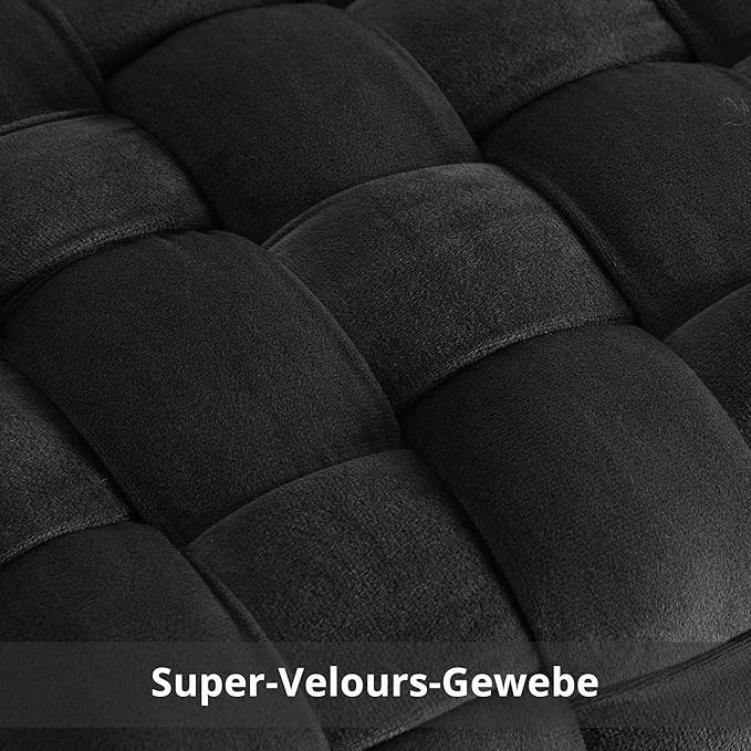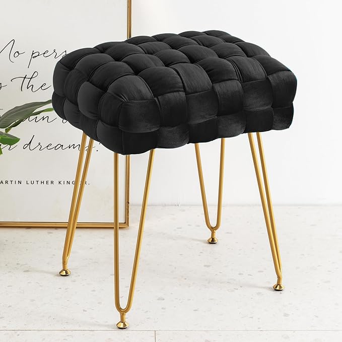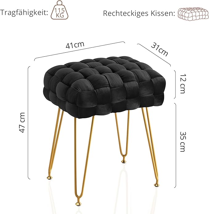 Elegantes und einzigartiges Erscheinungsbild: Hochwertiger Samtstoff, weich und gemütlich; handgefertigte Flechttechnik verleiht Charme und einen avantgardistischen Stil; vier robuste goldene Beine sorgen für Langlebigkeit und Stabilität; Rechteckiger Frisierhocker trägt bis zu 115 kg mit verbesserter Metallbasis.