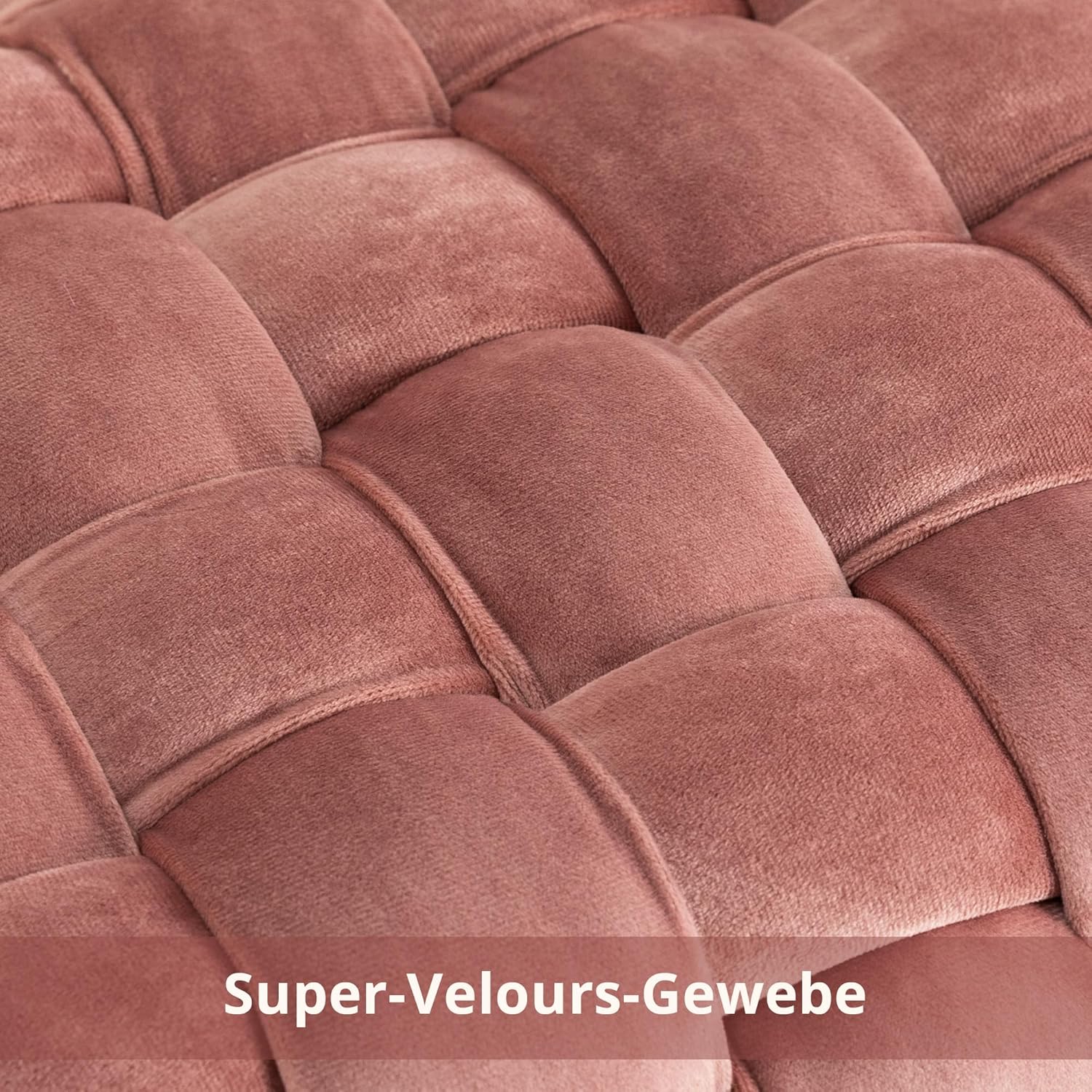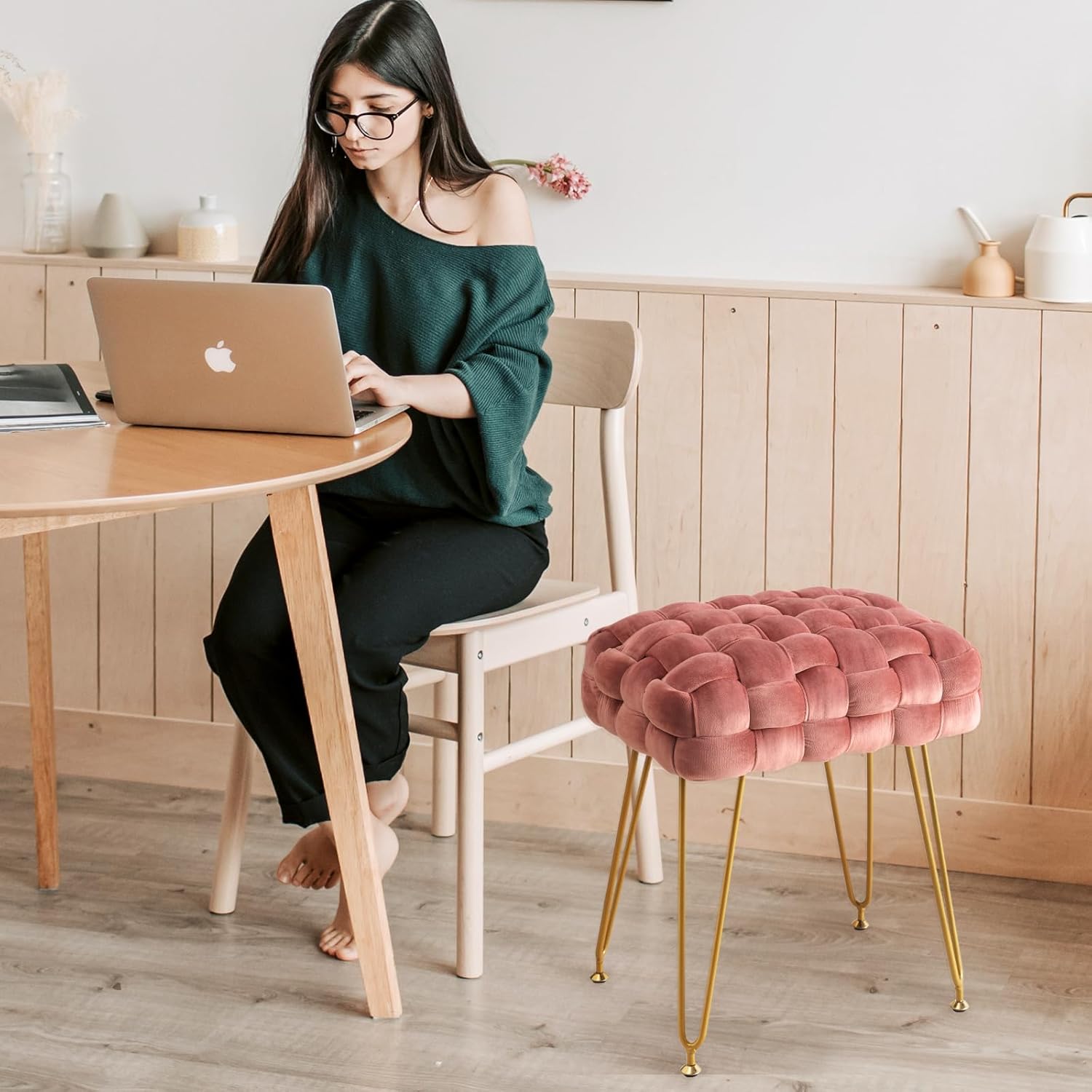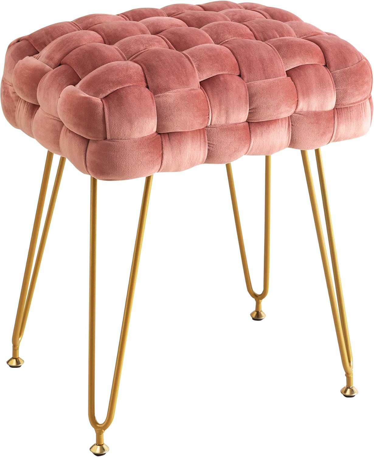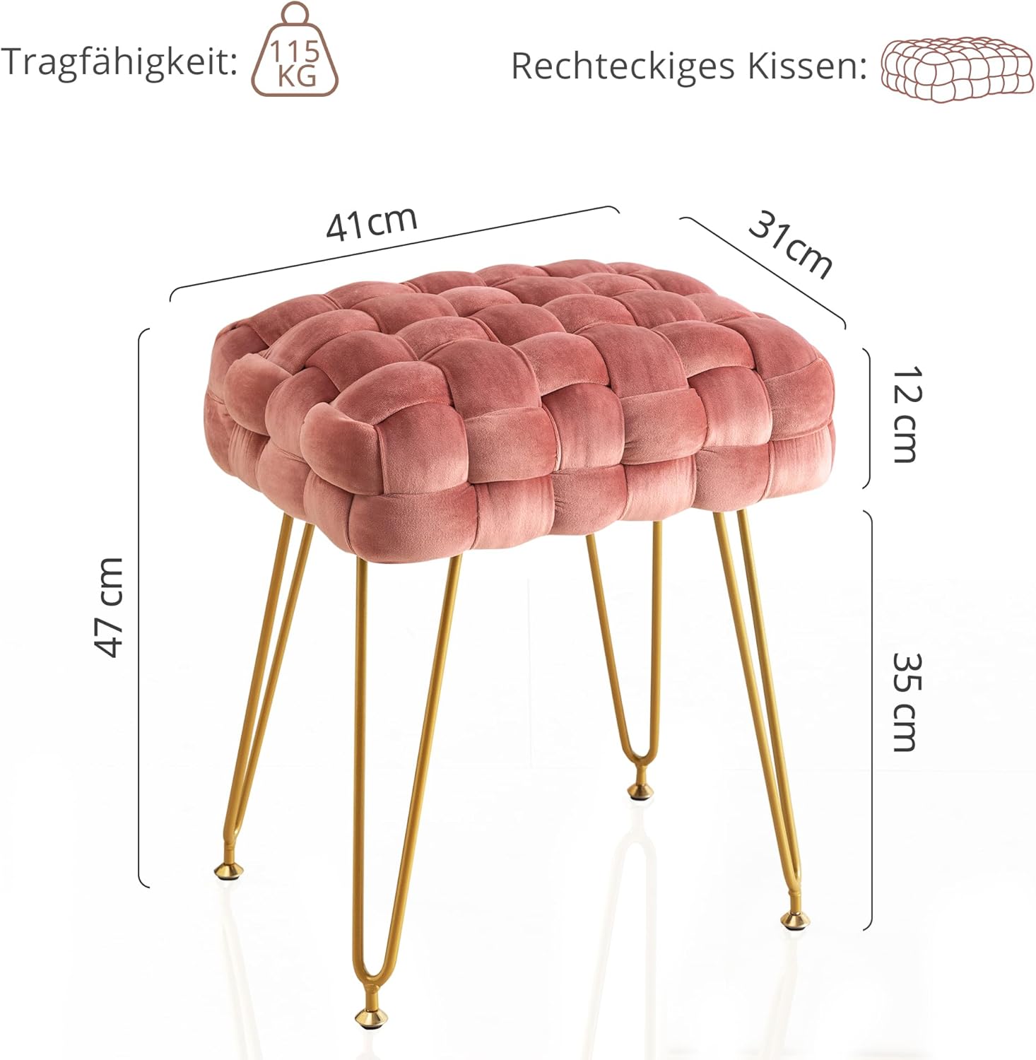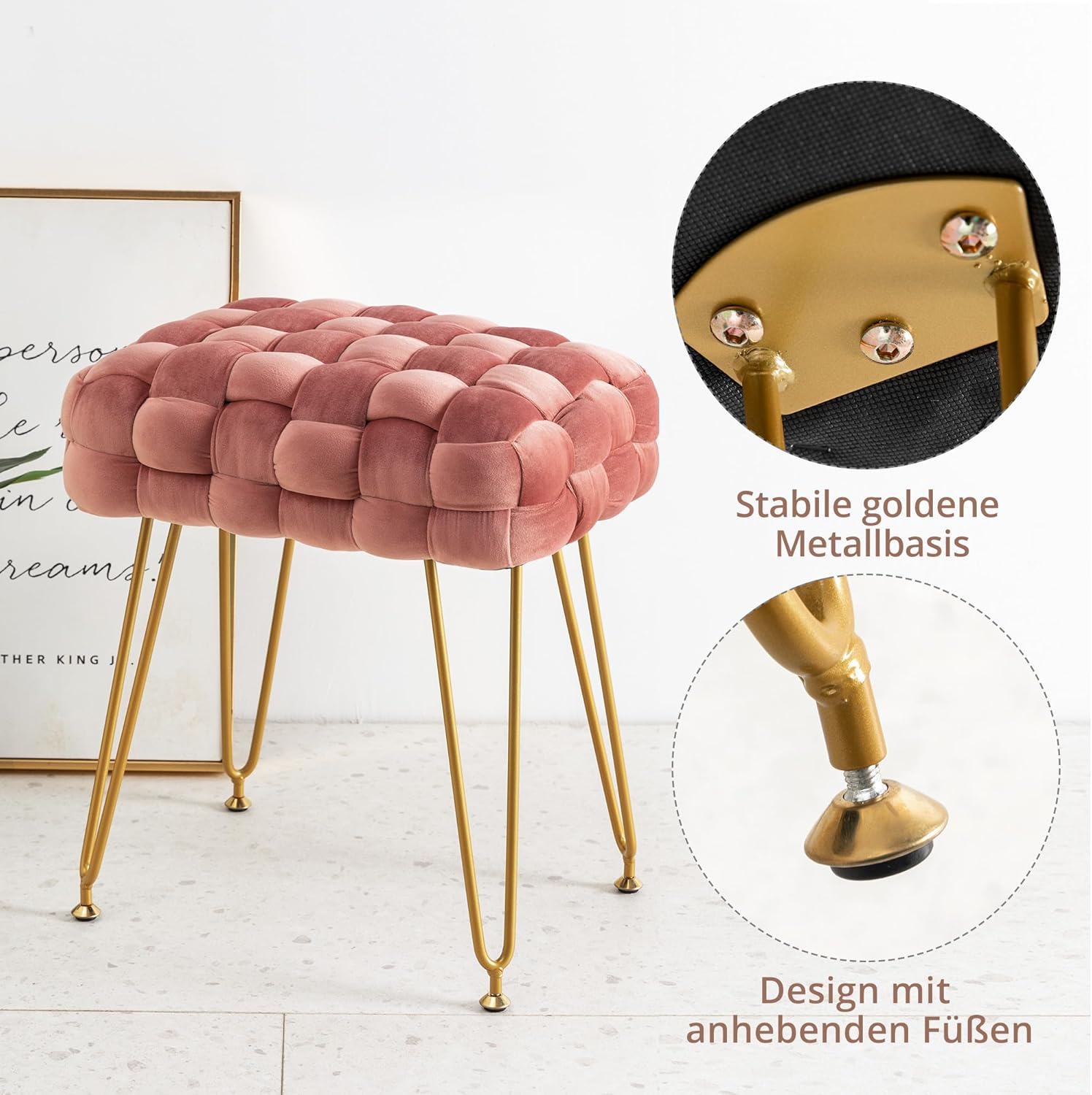 Elegantes und einzigartiges Erscheinungsbild: Hochwertiger Samtstoff, weich und gemütlich; handgefertigte Flechttechnik verleiht Charme und einen avantgardistischen Stil; vier robuste goldene Beine sorgen für Langlebigkeit und Stabilität; Rechteckiger Frisierhocker trägt bis zu 115 kg mit verbesserter Metallbasis.
