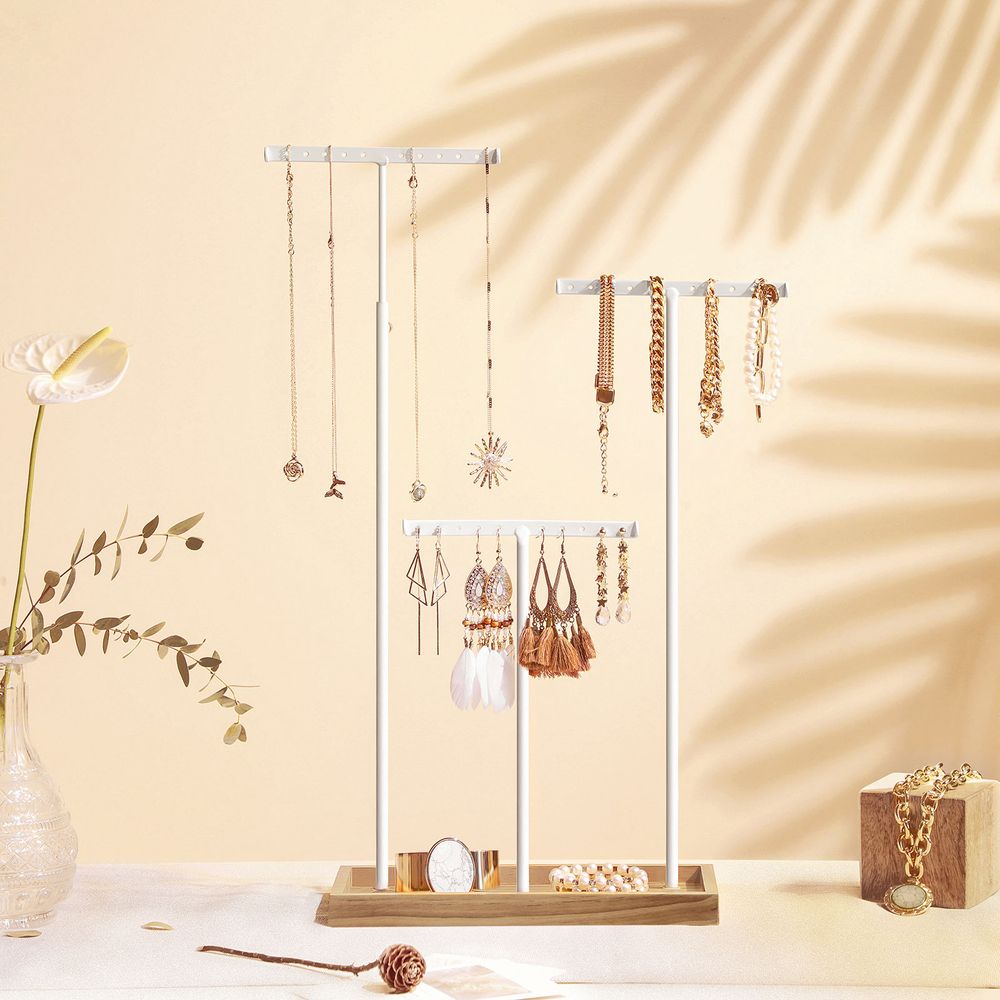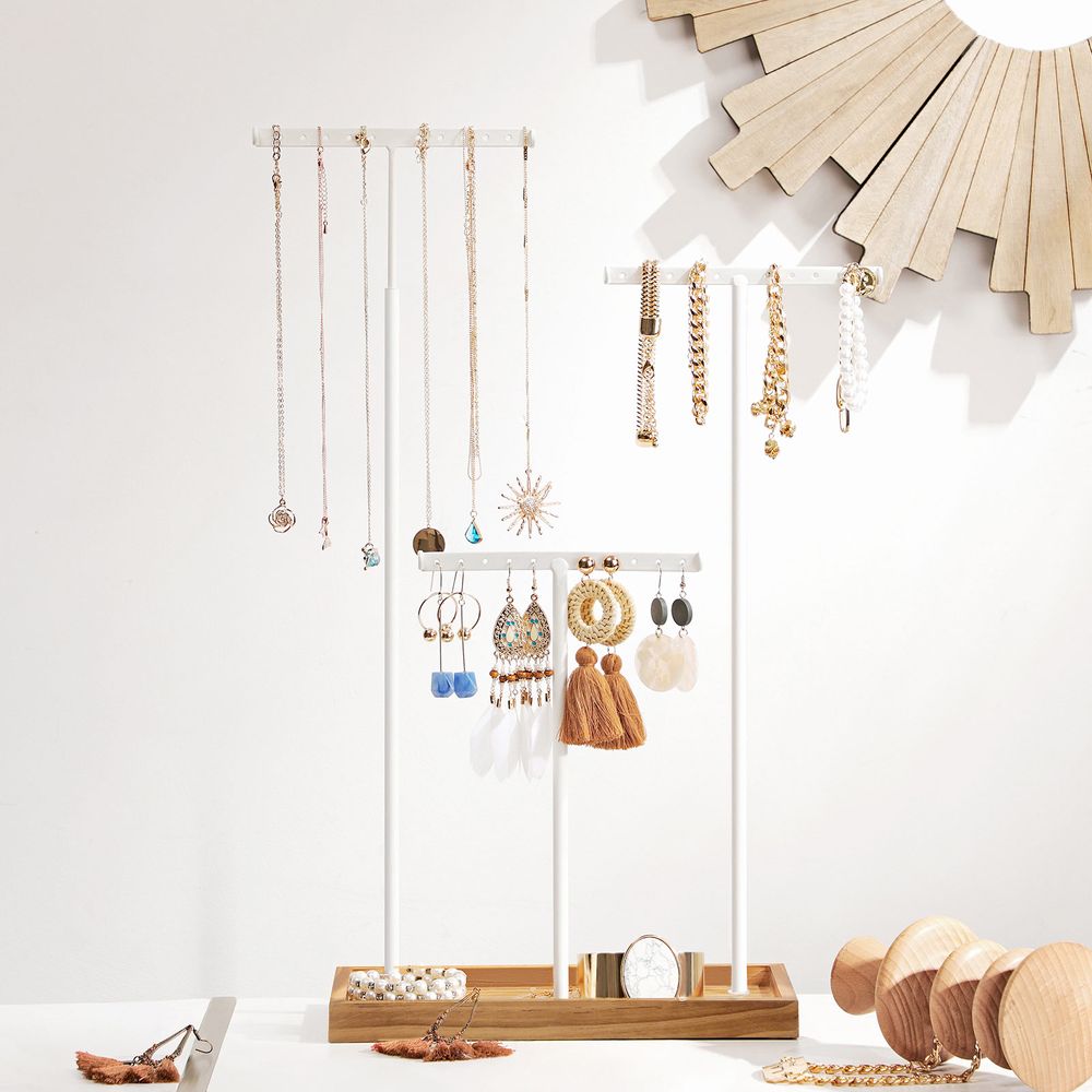 Herumliegender Schmuck gehört auf einen stilvolle Schmuckständer. Mit 3 Haltestangen und praktischem Holztablett sorgt dieser für perfekte Ordnung – elegant und griffbereit!